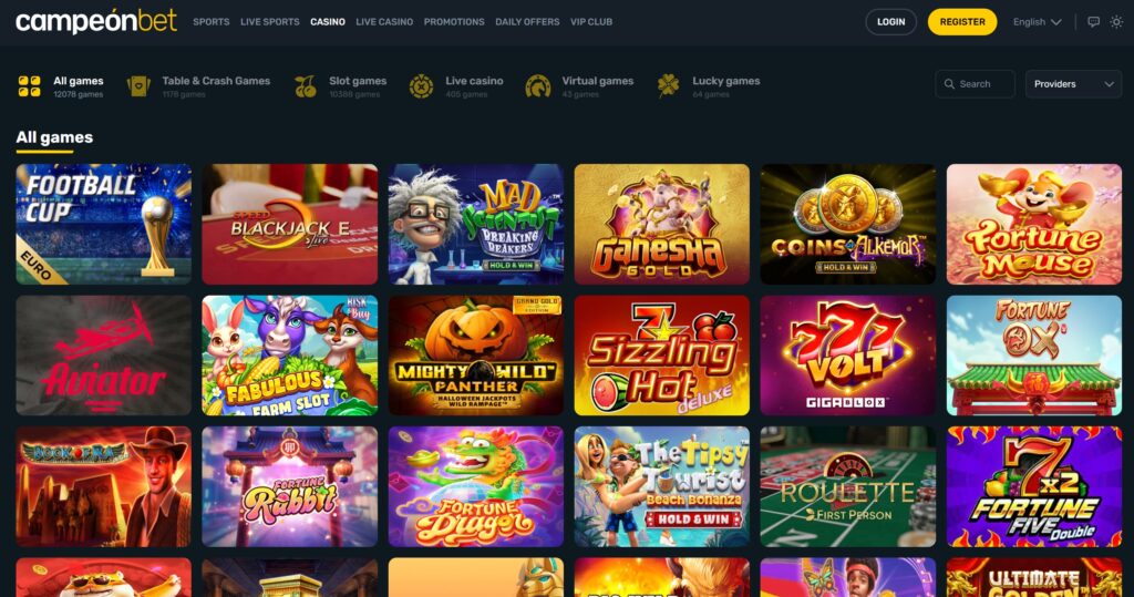 Campeonbet este un cazinou care mizează pe varietate. Oferta sa include mii de jocuri din toate categoriile importante, de la sloturi clasice până la jocuri live cu dealeri reali. Se lucrează cu furnizori de top precum NetEnt, Microgaming, Evolution, Pragmatic Play, Betsoft și mulți alții.